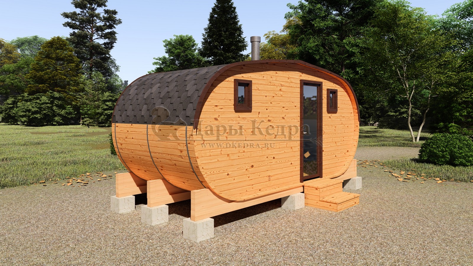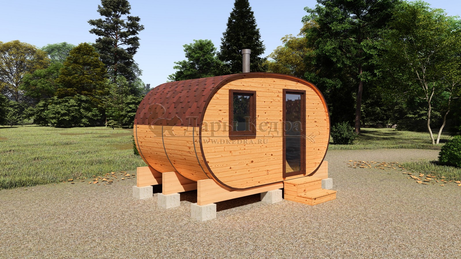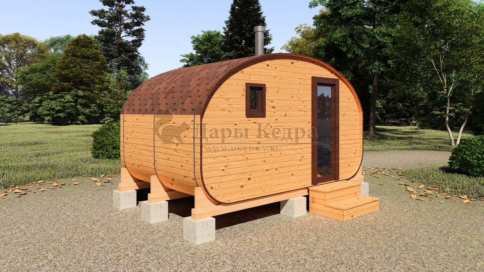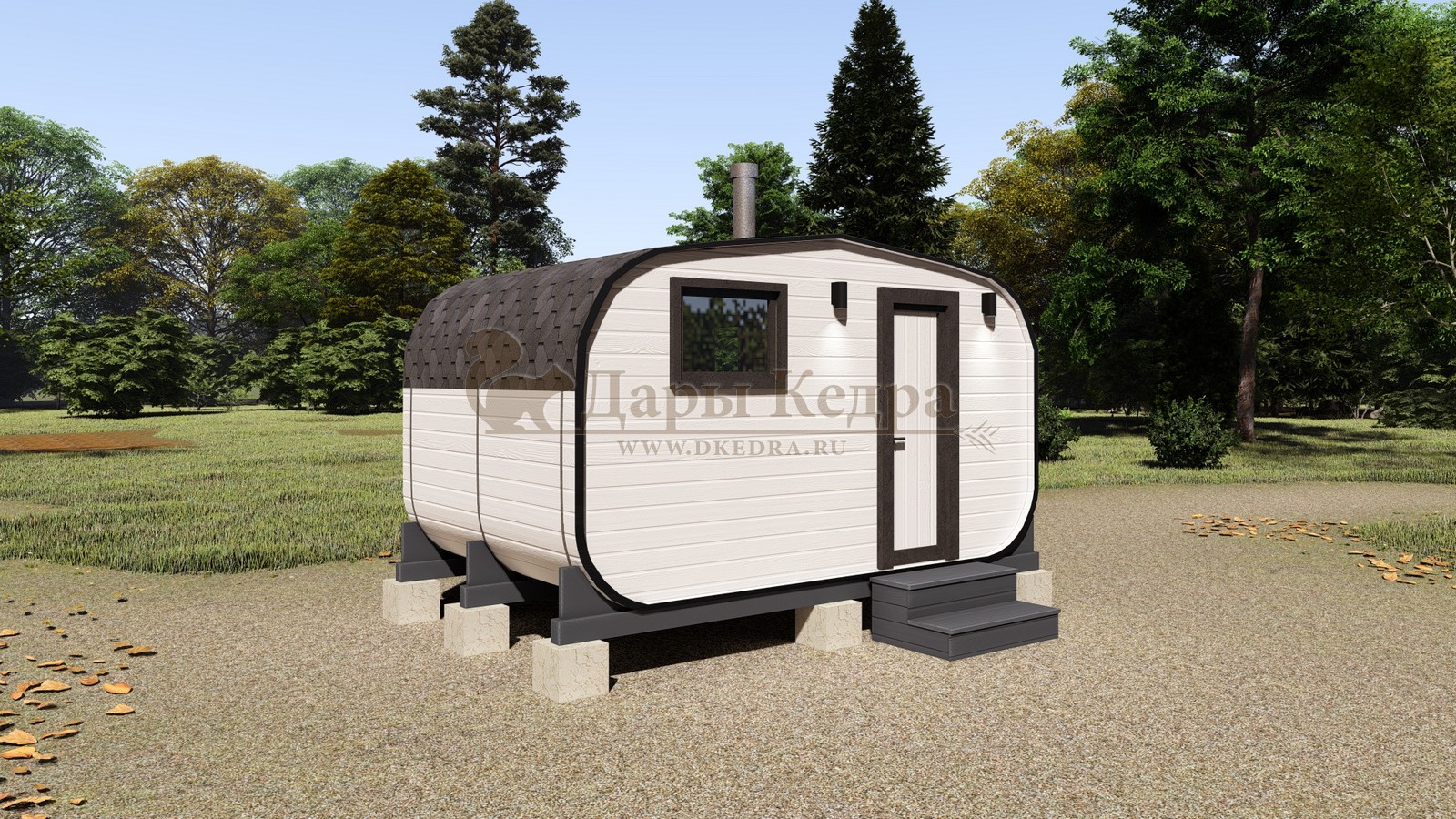 Симбиоз круглой и квадратной бани-бочки. Разработано с учётом эргономики, в ней так же просторно, как и в квадро-бочке, но при этом полукруглая крыша не дает задерживаться снегу и влаге на кровле. А еще такая баня безусловно красивая, мобильная и доступная каждому!