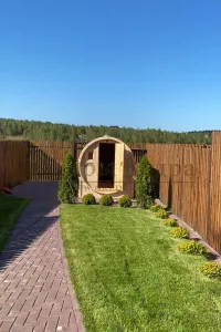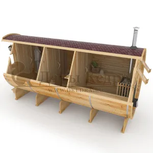 Это изделие круглой вытянутой формы с тремя отделениями: раздевалкой, моечной и парной. Во всех трех отделениях с обеих сторон установлены лавочки из кедра. Печь находится в парилке около дальней стены. Для удобства пользования в бане висят полочки из кедра и вешалка в раздевалке. Время растопки такой бани не превышает 30 минут. По вашему желанию баню-бочку можно дополнить печью с внешней загрузкой, благодаря которой весь мусор после топки останется на улице. Круглая баня-бочка не требует полноценный фундамент, поэтому при необходимости ее можно перенести в другое место.