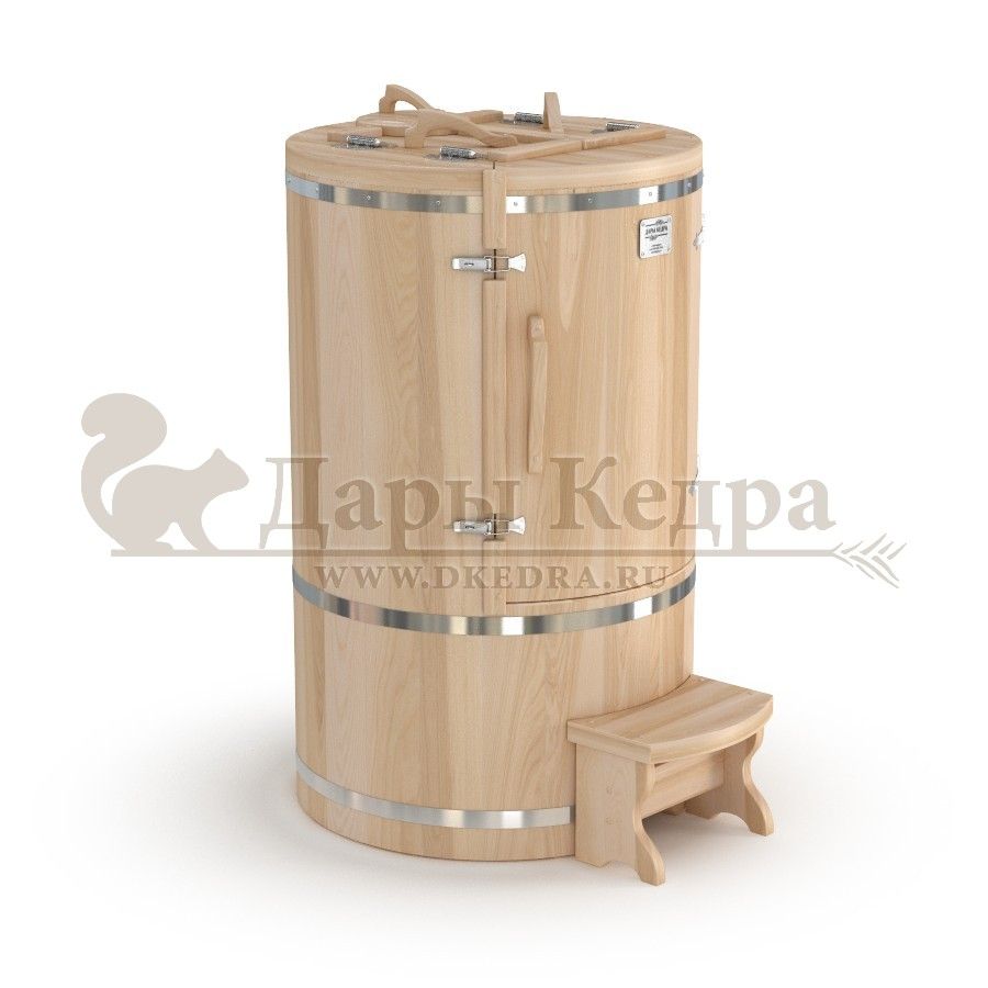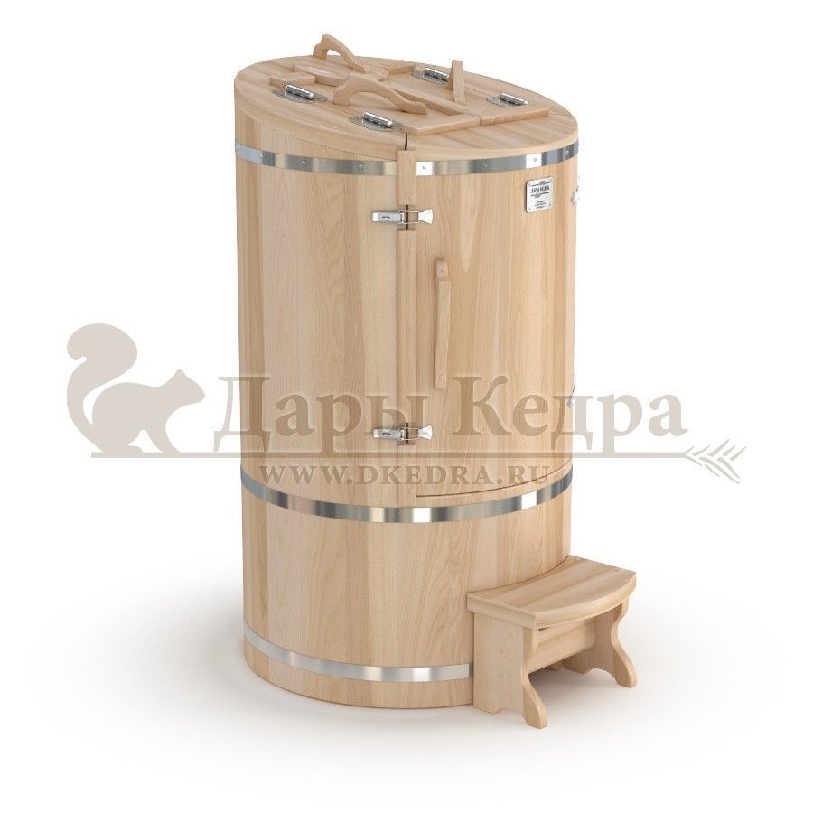 Кедровая бочка (фитобочка) овальная со встроенным парогенератором «Профессиональная» Овальная форма этой кедровой бочки позволяет комфортно разместится даже высоким людям. Встроенный парогенератор исключает дополнительный монтаж. Ширина 78 мм позволяет занести бочку в помещение со стандартным проёмом в собранном виде. Толщина стенок 45 мм позволяет увеличить срок службы изделия. Подходит для коммерческого использования.