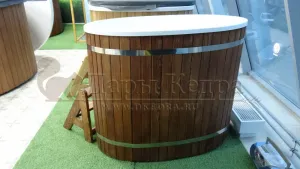 Это купель с внутренней овальной чашей, которая изготовлена из современного прочного и термоустойчивого материала (композита). Форма чаши обеспечивает комфортную посадку внутри изделия. Для удобного использования купель оснащена приставной лестницей. Обручи из нержавеющей стали декорируют купель с композитом и равномерно распределяют нагрузку во время процедур.