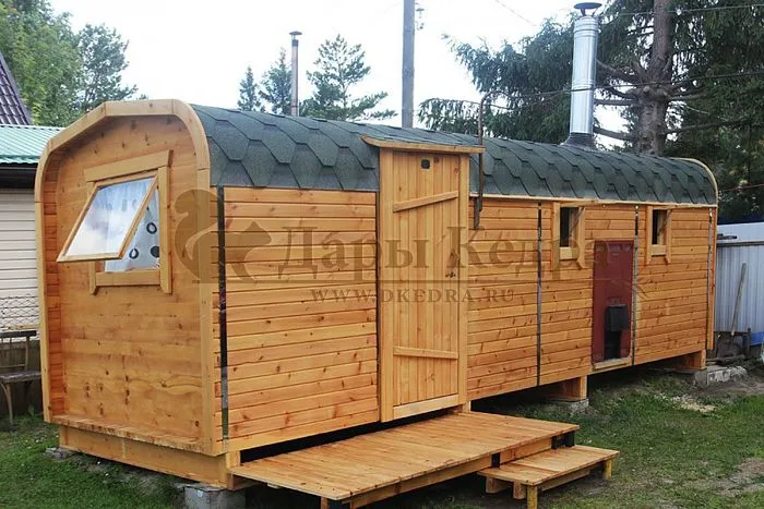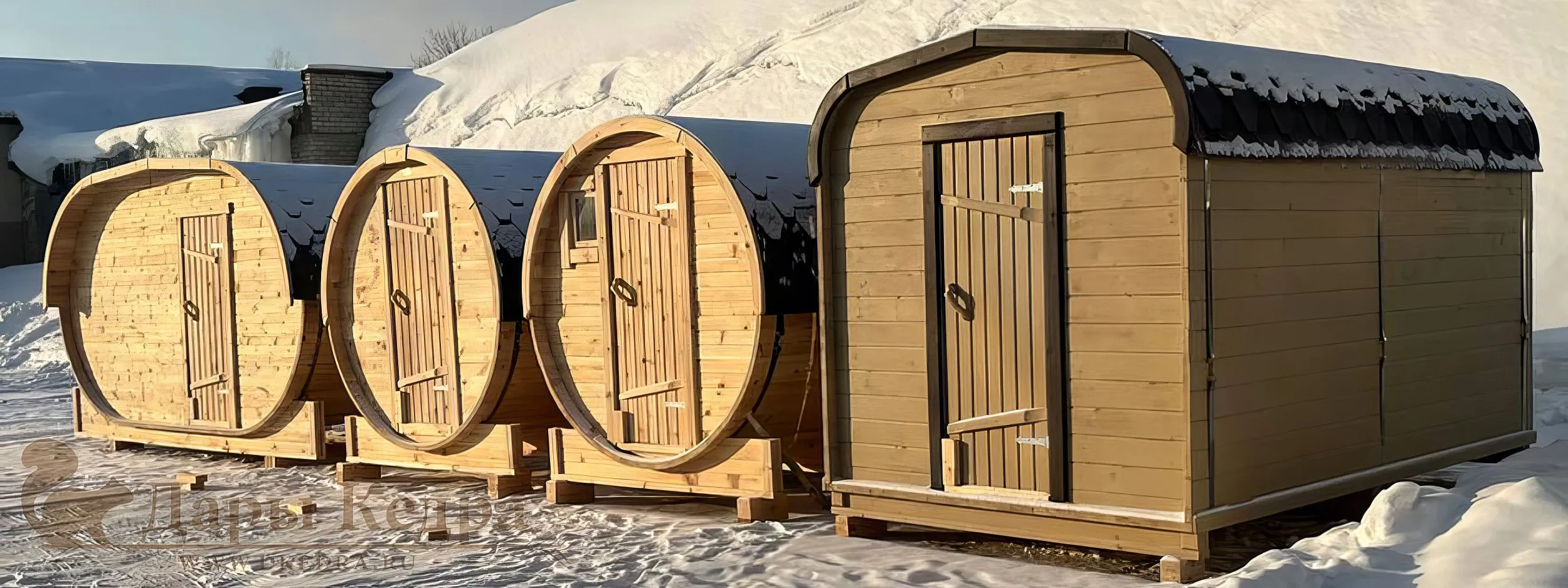 Мобильные парные бывают бочкообразными и каркасно-щитовыми. Причем, бочки могут быть квадратной, круглой, овальной формы или в виде буханки с закругленной крышей и прямым полом. С добавлением козырька или веранды, а также бокового входа, получаем уже более интересные внешне банные конструкции. Каркасно-щитовые конструкции представляют собой классические парные в привычном для русского человека исполнении, где есть парная, моечная, раздевалка.
