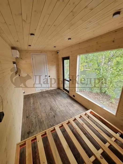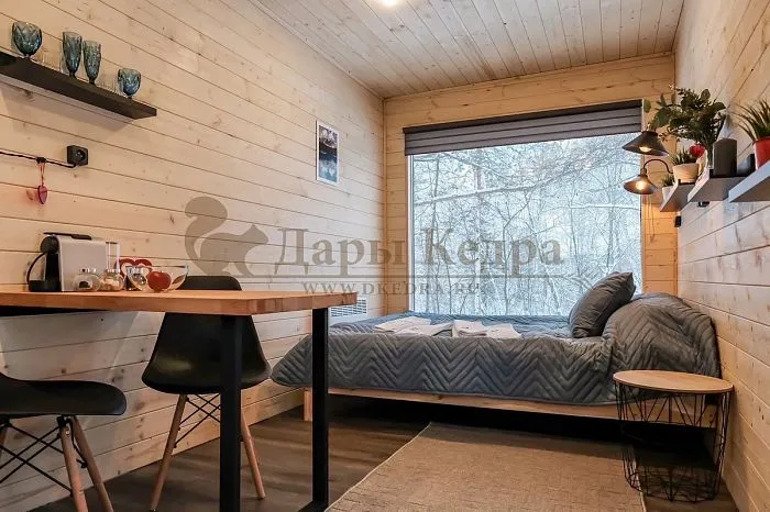 Обстановка внутри кемпинга не перегружена и наполнена природными материалами: обшивка стен осуществляется кедровой экологичной вагонкой, которая выглядит благородно, пахнет ароматно, создает тепло, уют, здоровую атмосферу деревянного дома. По желанию, стены, пол можно покрасить экологичной пропиткой для древесины.